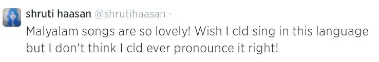 ‘మలయాళం’ పాటలు చాలా బాగుంటాయి. నాకు మలయాళంలో పాట పాడాలని ఉంది, కాని నాకు భాష సరిగా రాదు. పదాలను సరిగ్గా పలకగాలనో లేదో..? అంటూ చిన్న సందేహం వెలిబుచ్చింది.’ త్వరలో శృతికి మలయాళంలో పాట పడే అవకాశం రావాలని ఆశిద్దాం..!