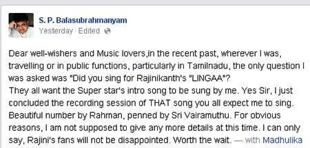 ఈ మధ్య తమిళనాడులో నేను పబ్లిక్ ఫంక్షన్స్, ఇతర సభలకు హాజరయినప్పుడు రజిని అభిమానుల నుండి ఒకే ఒక్క ప్రశ్న ఎదురవుతుంది. ‘లింగా’ సినిమాలో మీరు పాట పాడుతున్నారా..? అని. అభిమానులు అంతా రజినికాంత్ ఇంట్రడక్షన్ సాంగ్ నేను పాడాలని కోరుకుంటున్నారు. ఎస్… నేను రెహమాన్ స్వరపరిచిన ఒక అద్బుతమైన కంపోజిషన్ లో నేను పాడడం జరిగింది. ఇటివలే రికార్డింగ్ పూర్తిచేశాం. వైరముత్తు లిరిక్స్ అందించారు. ప్రస్తుతానికి ఇంతకంటే ఎక్కువ చెప్పలేను. కాని, ఒక్క మాట.. రజిని అభిమానులు ఈసారి నిరాశ చెందరు. అని సోషల్ మీడియాలో పోస్ట్ చేశారు.