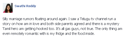 ‘నా పెళ్లి గురించి మరోసారి గాలి వార్తలను ప్రసారం చేస్తున్నారు. వీటిని నమ్మవద్దు. నా ఫ్రిడ్జ్, అందులో ఉన్న ఫుడ్ తో మాత్రమే నేను ప్రేమలో పడ్డాను’ అంటూ సోషల్ మీడియాలో పేర్కొంది.