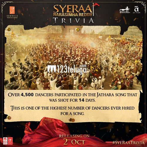 కాగా జార్జియా లో చిత్రీకరించిన ఒక్క వార్ ఎపిసోడ్ కొరకు 75కోట్ల బడ్జెట్ కేటాయించిన చిత్ర బృందం ఈ మూవీ లో ప్రతి సన్నివేశం కొరకు రాజీపడకుండా నిర్మిచారని సమాచారం. అలాగే సైరా మూవీలో జాతర నేపథ్యంలో వచ్చే ఓ పాట కొరకు ఏకంగా 4500మంది డాన్సర్స్ తో 14రోజుల పాటు చిత్రీకరించారట. ఇప్పటివరకు అత్యధిక డాన్సర్స్ పాల్గొన్న పాటగా సైరా లోని ఈ పాట నిలిచిపోతుందని సమాచారం. చిరంజీవి కి జంటగా నయనతార, తమన్నా నటిస్తుండగా బాలీవుడ్ మెగాస్టార్ అమితాబ్, జగపతి బాబు, సుదీప్, విజయ్ సేతుపతి ఇతర కీలక పాత్రలలో కనిపించనున్నారు. ఈ చిత్రానికి సంగీతం అమిత్ త్రివేది అందిస్తున్నారు.