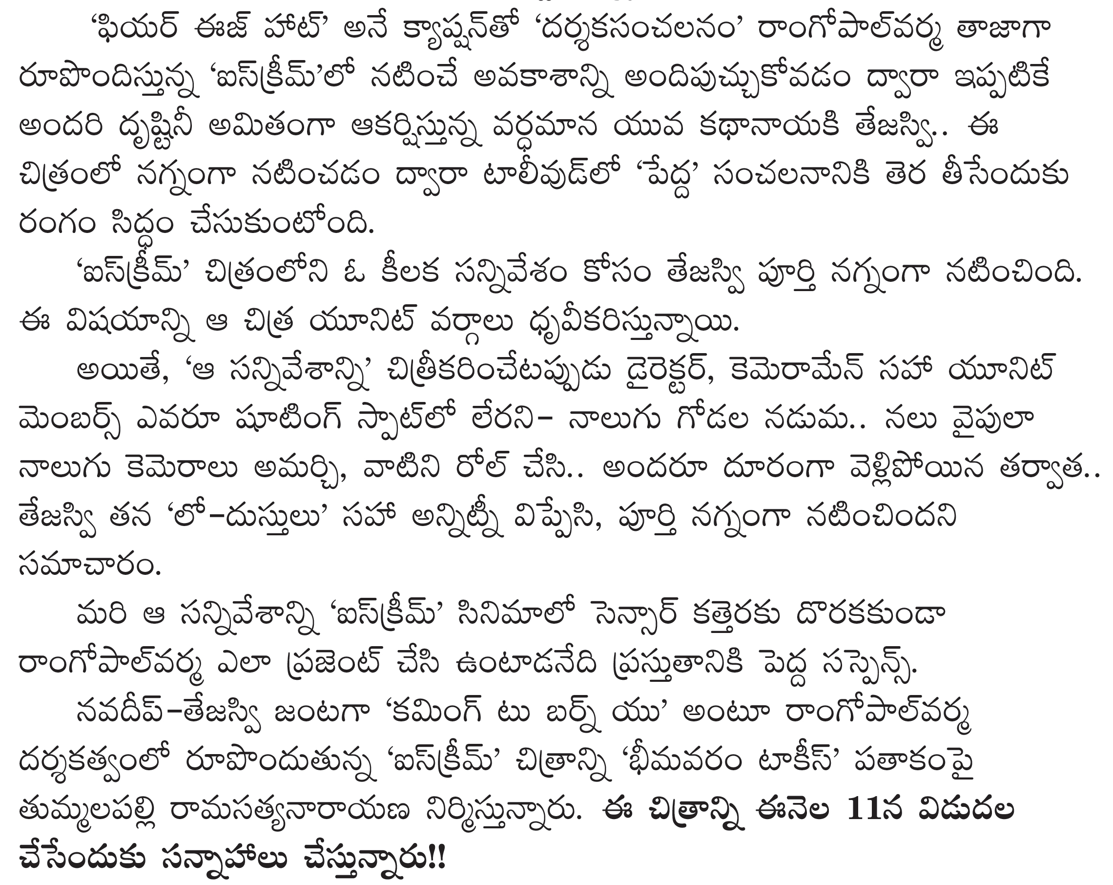 ‘సీతమ్మ వాకిట్లో సిరిమల్లె చెట్టు’ సినిమాలో సమంత చెల్లెలుగా, ‘హార్ట్ ఎటాక్’ సినిమాలో మోడరన్ క్యారెక్టర్లో నటించి ప్రేక్షకులలో మంచి గుర్తింపు సొంతం చేసుకుంది తెలుగమ్మాయి తేజస్వి. తర్వాత రామ్ గోపాల్ వర్మ దర్శకత్వంలో వచ్చిన ‘ఐస్ క్రీం’ సినిమాతో హీరోయిన్ గా ప్రమోట్ అయ్యింది. తొలి సినిమాతోనే సంచలనం సృష్టించింది. తాజాగా ‘హోలీ'(వర్కింగ్ టైటిల్) అనే తమిళ సినిమాలో నటించడానికి అంగీకరించింది. తమిళంలో ఆమెకిది తొలి సినిమా.
