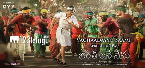 డివివి దానయ్య నిర్మాణంలో మహేష్ బాబు హీరోగా కైరా అద్వాని హీరోయిన్ గా నటిస్తోన్న సినిమా ‘భరత్ అనే నేను’. ఏప్రిల్ 20 న ప్రేక్షకుల ముందుకురాబోతున్న ఈ సినిమాలోని రెండు పాటలు ఇప్పటికే విడుదలయ్యాయి. రేపు సాయంత్రం 5 గంటలకు ఈ చిత్రం నుండి ”వచ్చాడోయ్ సామి” పాట విడుదల కాబోతోంది.