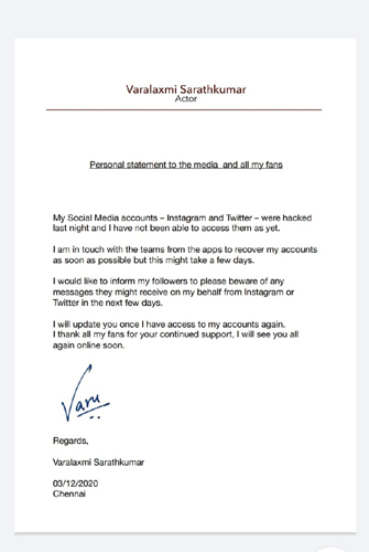 ఇప్పుడు ఈమె సోషల్ మీడియా అకౌంట్స్ హ్యాక్ అయ్యాయి అని ఆమె చెప్తున్నారు. తన ఇన్స్టాగ్రమ్ మరియు ట్విట్టర్ అకౌంట్స్ రెండు కూడాను నిన్న రాత్రి హ్యాక్ అయ్యాయి అని తాను ఇప్పటికీ కూడా వాటిని యాక్సిస్ చెయ్యలేకపోతున్నాని తెలిపారు. వాటిని సాధ్యమైనంత త్వరలో తిరిగి పొందేందుకు ప్రయత్నం చేస్తున్నాని..