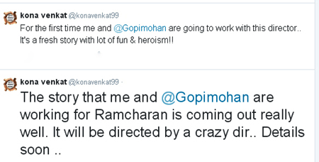 ‘రామ్ చరణ్ కోసం నేను, గోపి మోహన్ కలసి రాస్తున్న కథ రెడీ అయ్యింది. హీరోఇజం & వినోదంతో కూడిన ఓ కొత్త కథ ఇది. స్క్రిప్ట్ చాలా బాగా వచ్చింది. ఈ సినిమాకు ఓ క్రేజీ దర్శకుడు దర్శకత్వం వహిస్తారు. మొదటిసారి ఈ దర్శకుడితో కలసి పని చేయబోతున్నాం. త్వరలో మరిన్ని వివరాలు వెల్లడిస్తాం. అంటూ కోన వెంకట్ సోషల్ మీడియాలో వెల్లడించారు. దాంతో ఎవరా క్రేజీ దర్శకుడు అంటూ మెగా అభిమానులలో చర్చలు మొదలయ్యాయి.