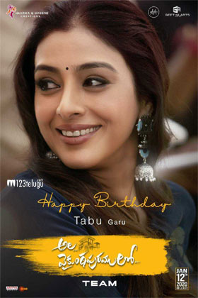 స్టైలిష్ స్టార్ అల్లు అర్జున్ – స్టార్ డైరెక్టర్ త్రివిక్రమ్ కలయికలో వస్తోన్న ‘అల వైకుంఠపురములో’ ఒకప్పటి హాట్ హీరోయిన్ టబు కూడా కీలక పాత్రలో నటిస్తోంది. కాగా నేడు టబు పుట్టినరోజు. ఈ సందర్భంగా, ఈ సినిమాలో ఆమె లుక్ ను విడుదల చేసింది చిత్రబృందం. లుక్ కూల్ గా నెటిజన్లను బాగా ఆకట్టుకుంటుంది. ఇక 2020 సంక్రాంతికి ఈ చిత్రాన్ని ప్రేక్షకుల ముందుకు తీసుకొచ్చేందుకు సన్నాహాలు చేస్తున్న నేపథ్యంలో ప్రస్తుతం ఈ సినిమా శరవేగంగా షూటింగ్ జరుపుకుంటుంది. ఇక బన్నీ – త్రివిక్రమ్ కాంబినేషన్ కావడంతో సినిమా పై భారీ అంచనాలు ఏర్పడ్డాయి.