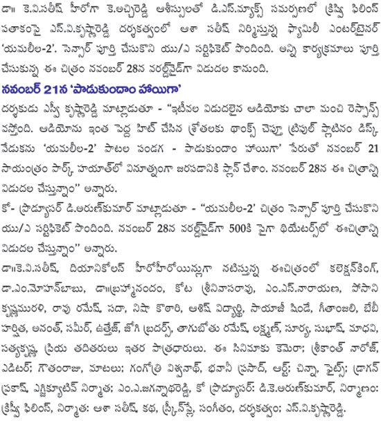 నవంబర్ 21న పాడుకుందాం హాయిగా – ‘యమలీల 2’